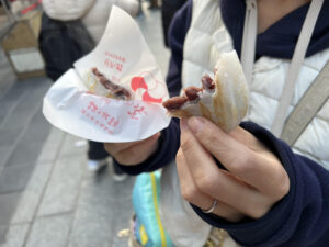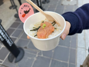 食べ歩きでは「梅ヶ枝餅」と、ふくやの「サーモン明太子茶漬け」を食べました。